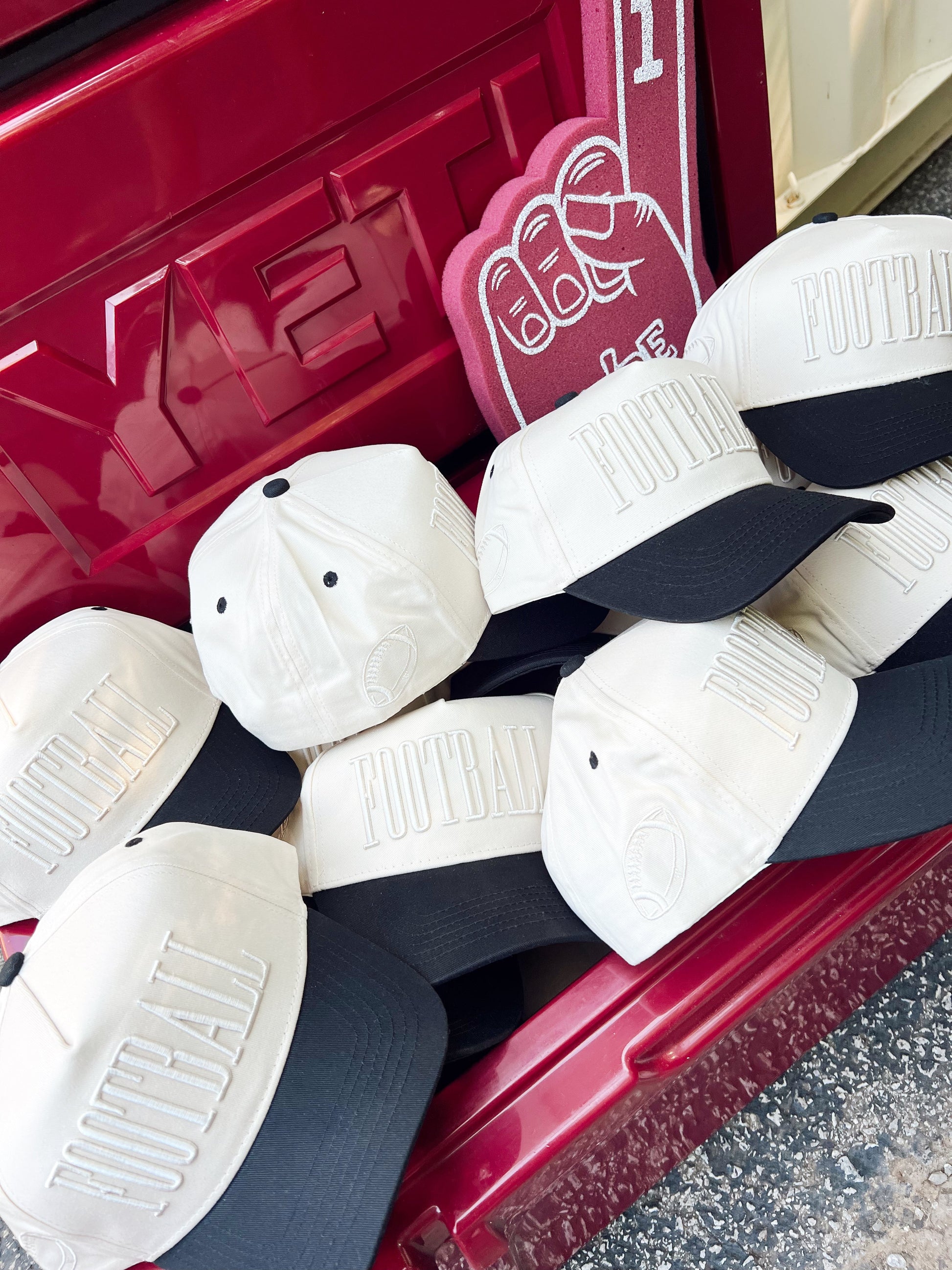 - This monochromatic vintage trucker hat with puff embroidery says FOOTBALL and has a football embroidered on the side.